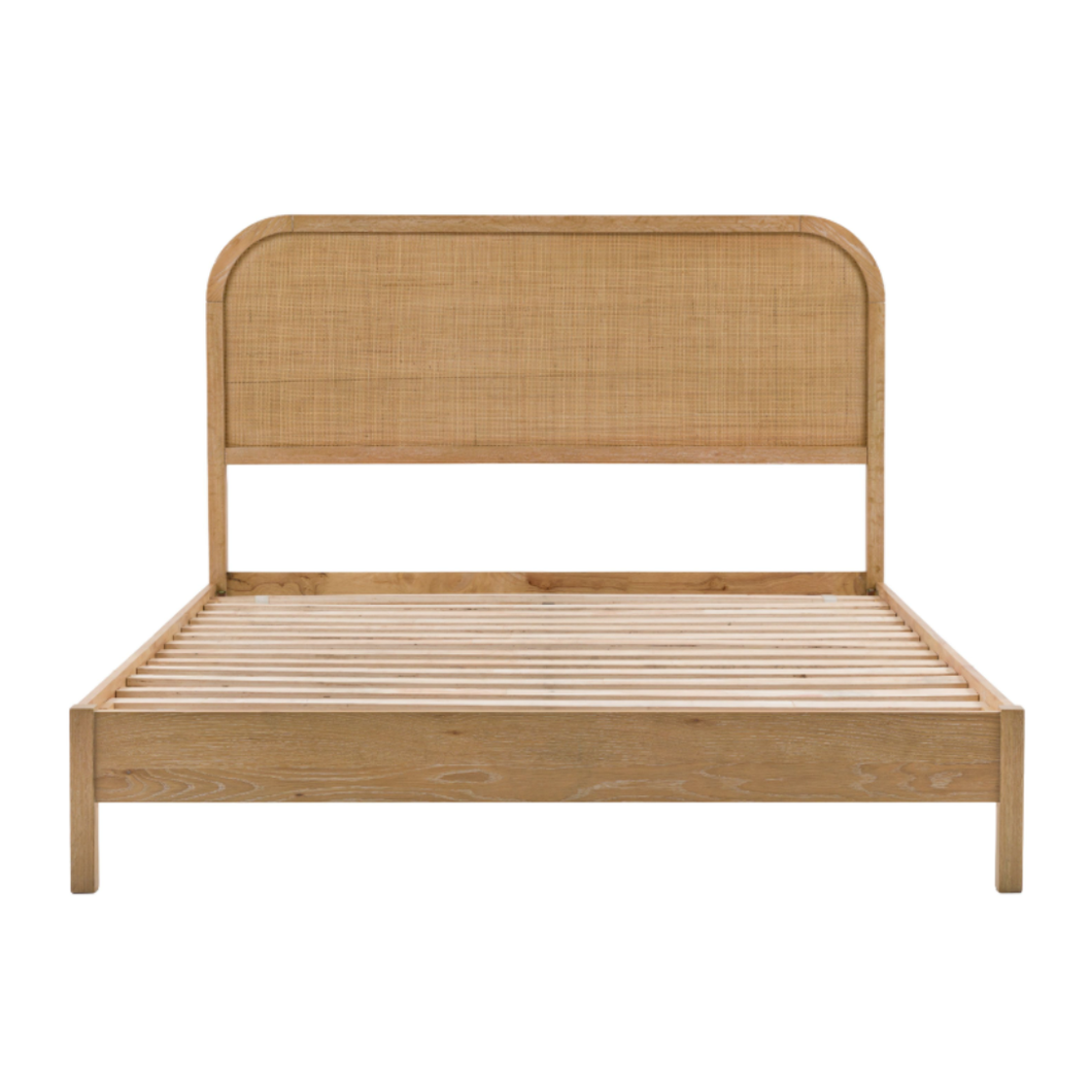 The hand-woven rattan headboard panels serve as a distinctive focal point, introducing organic texture and artisanal character to your bedroom. A soft lime-washed finish creates an understated, sophisticated aesthetic with genuine depth, whilst gently curved architectural details soften the overall silhouette.