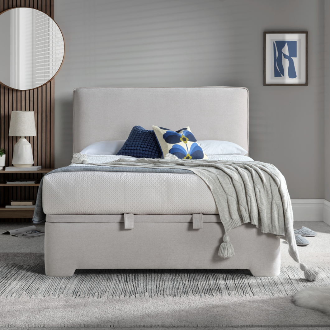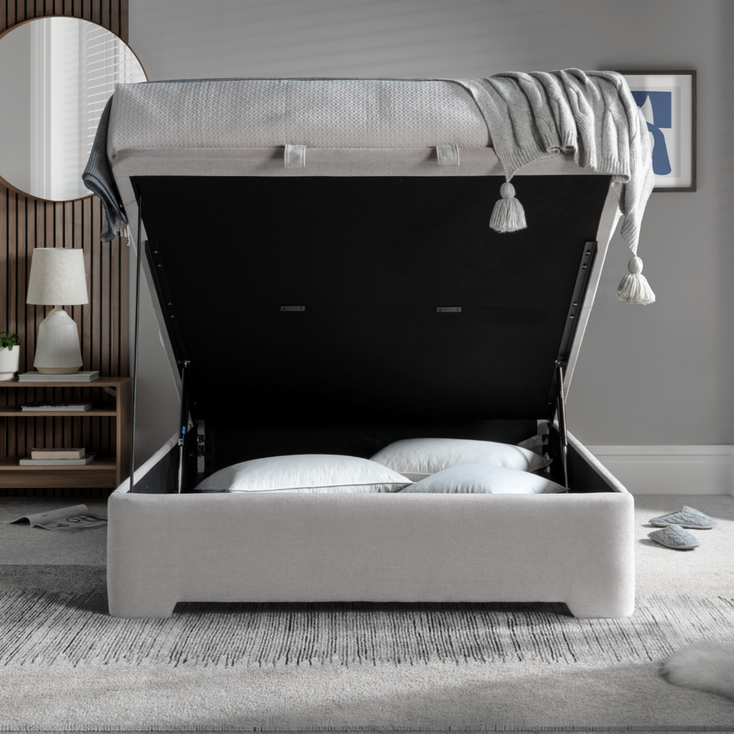 The spacious ottoman storage area provides a much desired storage facility suitable for concealing bedroom clutter and can be easily accessed using the dual straps to activate the hydraulic assisted lift up system.
